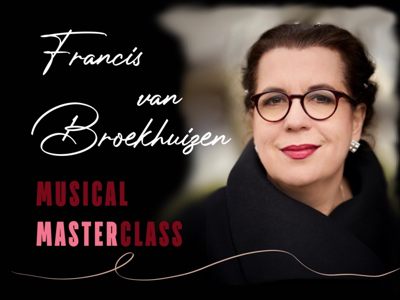 Op zaterdag 31 januari gaat de enige echte Francis van Broekhuizen aan de slag met getalenteerde musical zangers en zangeressen. Ze geeft uitgebreide privélessen waar jij als publiek ook enorm veel van zult opsteken. Een masterclass dus!