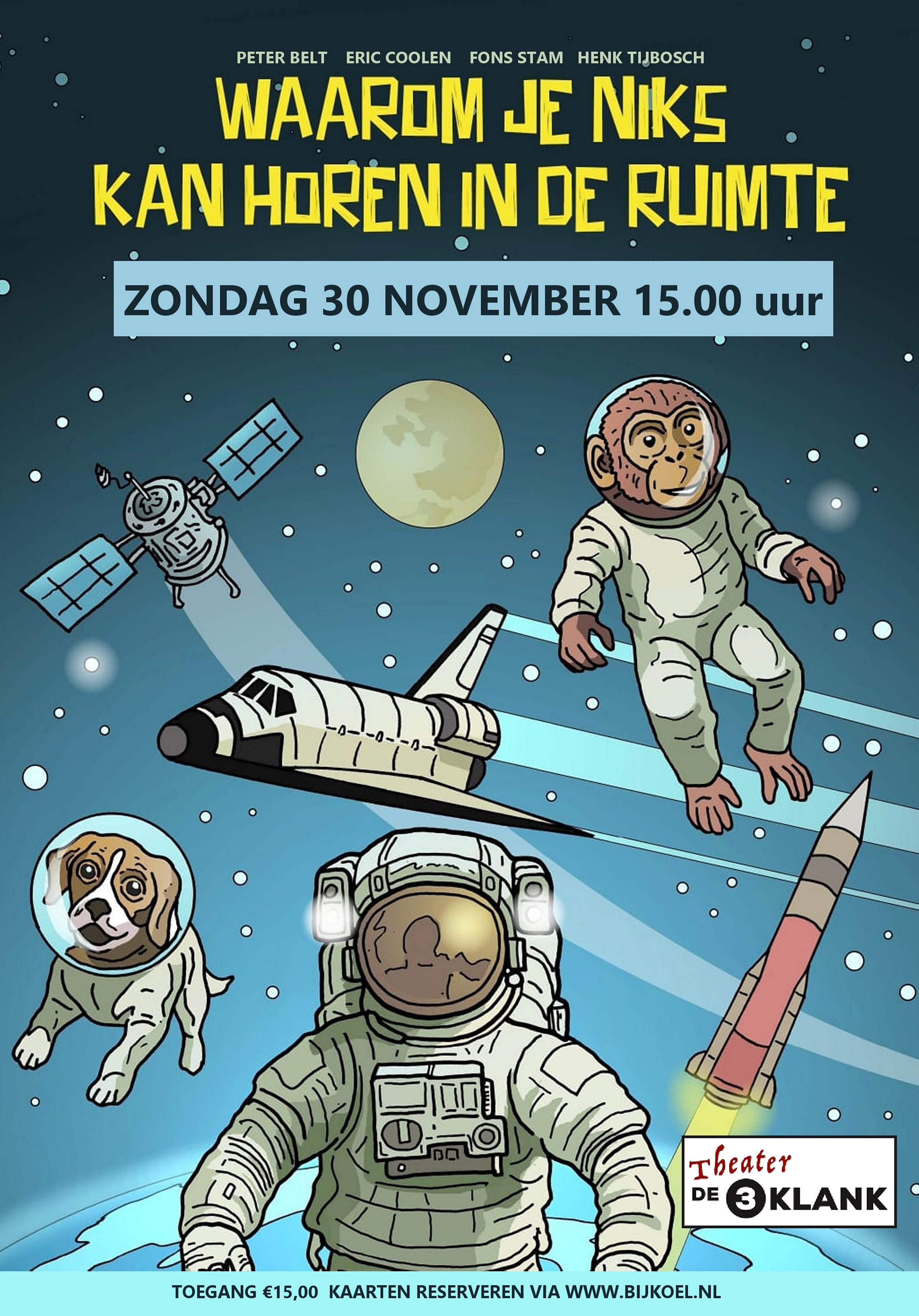 Peter Belt (werkzaam bij Space Expo) en Eric Coolen (tekenaar) maakten samen het populaire Spel- en Doe Boek "Waarom je niks kan horen in de ruimte" (uitgeverij Ezo Wolf). Nu gaan zij samen met Fons Stam en Henk Tijbosch de theaters in met de gelijknamige show. En zaterdag 30 november staan ze in Theater De 3Klank!